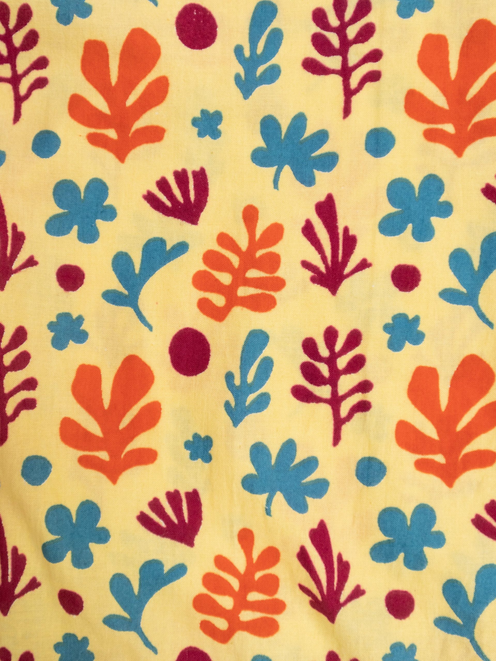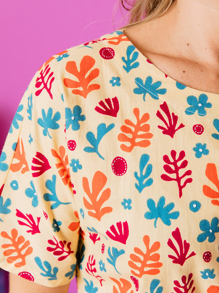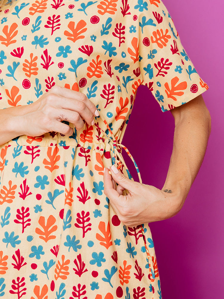 Aimee pairs maximum fun with maximum details like hidden pockets. hand embroidered shapes. and hand screen printed fabric in a vibrant artful pattern. Use the self tie to adjust the waist to be tighter or have a more loose t-shirt dress fit depending on your style preference.