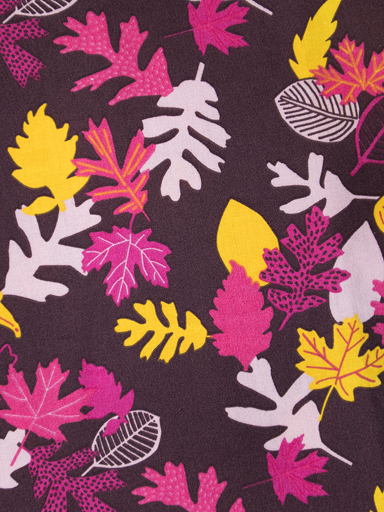 Bold autumnal leaves adorn this short sleeved midi dress. Elastic ruching at the waist gives the Artsy Traveler the cinched look with a comfortable fit.
