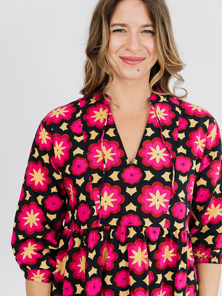 + Free ShippingYour favorite fair trade mini dress is back with a big update – the Sohla now has pockets! This dress features a bold pink and red tile design hand printed on 100% cotton. subtle French knot embroidery on the bodice. three-quarter sleeves. and a cute tie front v-neck. Plus. pockets – you asked. and we answered! Enjoy this easy-fitting mini that hits above the knee. but isn’t too short. We love the Sohla on days we want to throw on something ultra-comfortable and still look put together and stylish. but this dress looks great dressed up with heels and an up-do for a night out too.